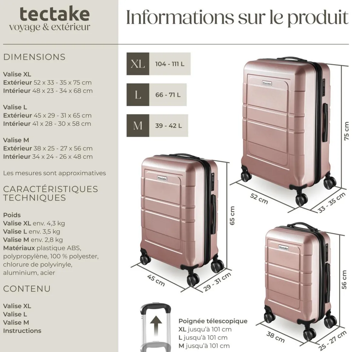 - Hauteur avec poignée télescopique déployée : env. 101 cm