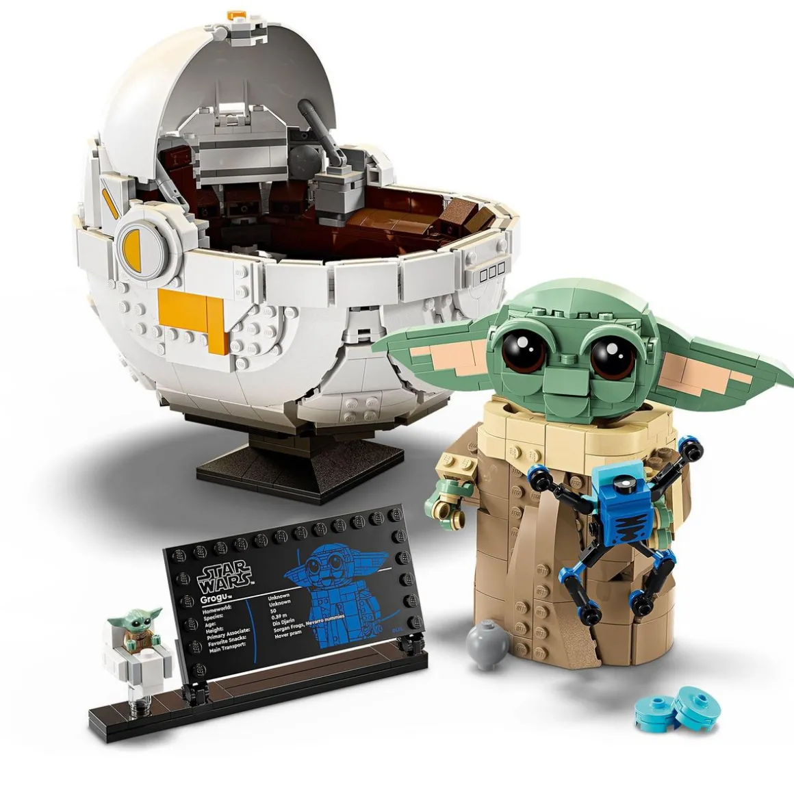 La maquette principale de ce jouet de construction Star Wars à collectionner s’accompagne d’une figurine LEGO de Grogu de taille standard dans un petit landau à construire, ainsi que d’une plaque descriptive.