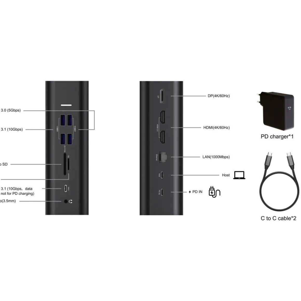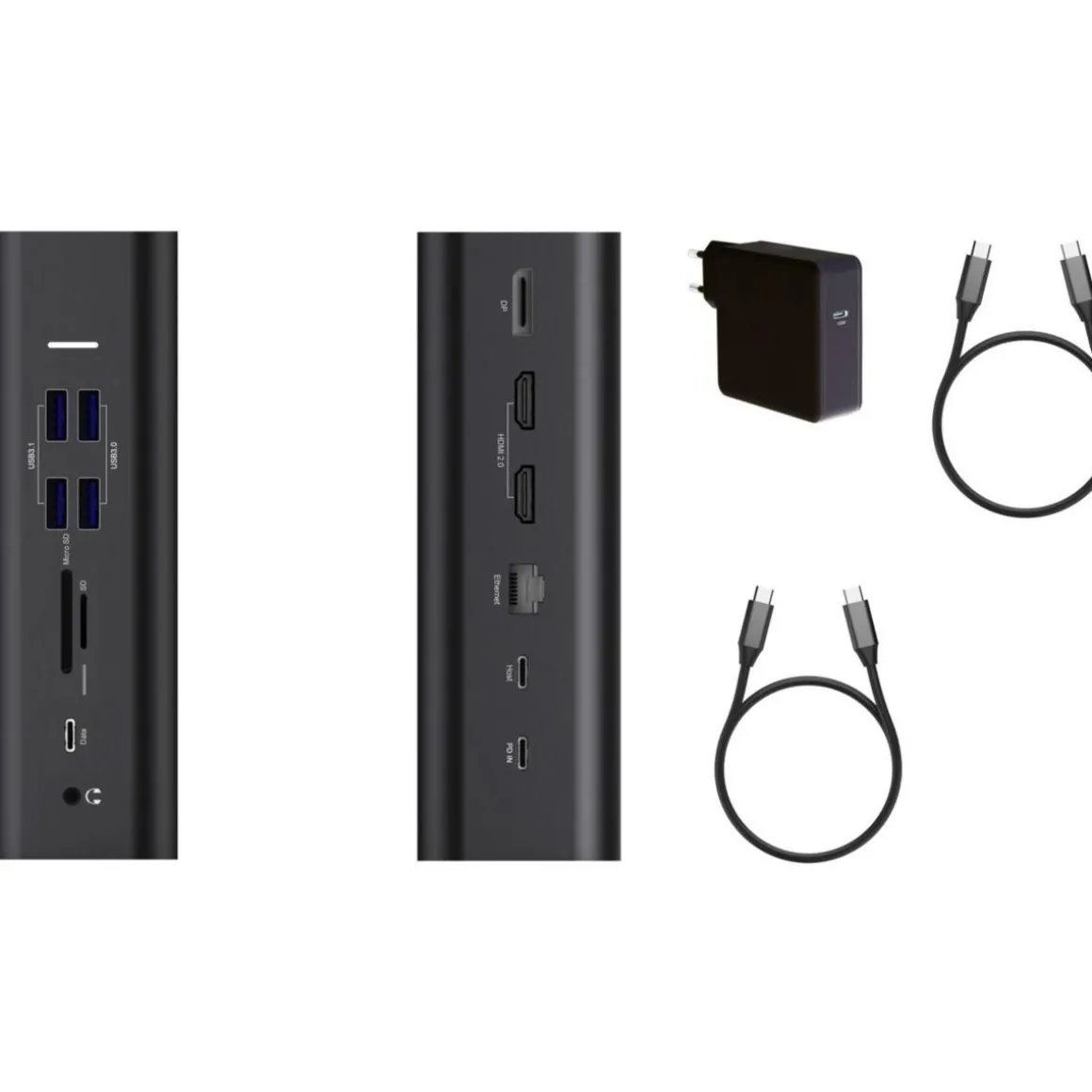 | Avantages | L’adaptateur 100 Watts Power Delivery permets de recharger rapidement tous vos appareils en USB-C. Avec ces 14 ports, cette station d’accueil vous permettra de travaille plus efficacement en connectant tous vos périphériques en un seul endroit. | |