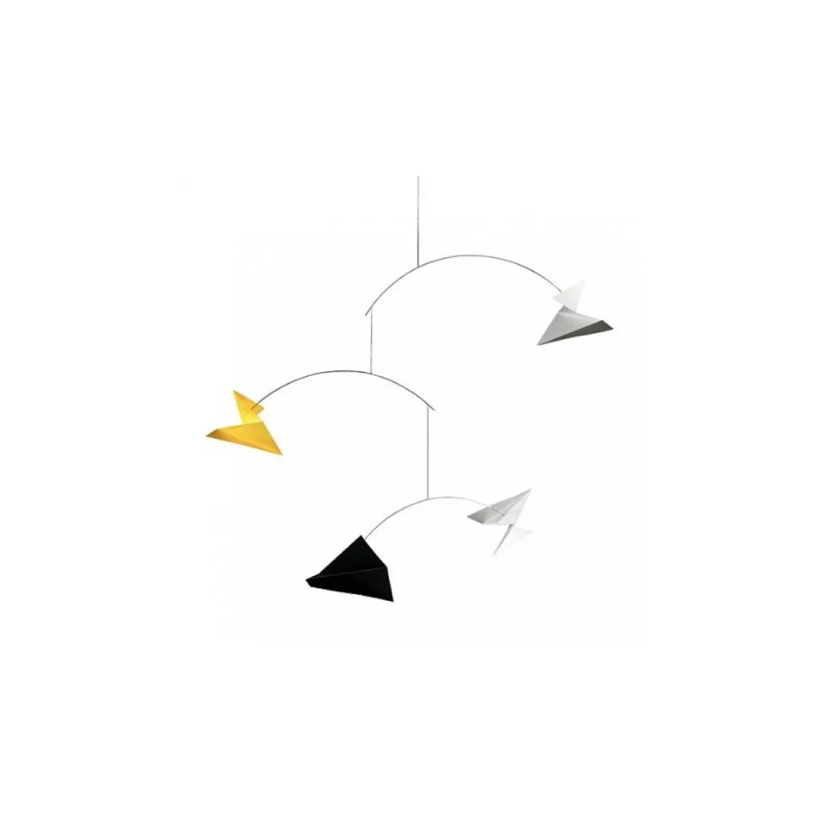Un mobile pour l’exploration de l’espace. Comme s’il se déplace silencieusement dans votre propre univers, regarder les ombres changeantes, et réfléchissez à combien de formes peuvent être produites à partir d’un carré qui est plié trois fois. Un mobile moderne à l’ère de l’espace. Les quatre carrés pliés produisent des formes futuristes et des ombres fascinantes. Les «nuages» sont en jaune, gris, noir et blanc. Fonctionnalité supplémentaire: Un nuage rouge est inclus pour adapter le mobile à votre humeur. Conception: Ole Flensted Taille: 65 x 85 cm Matériel: papier Serigraphical