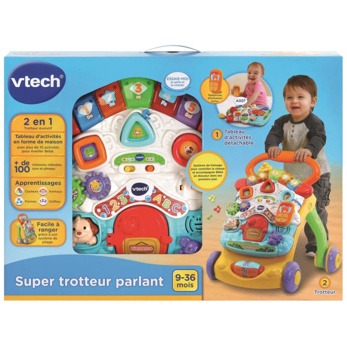 Grâce au super trotteur parlant 2 en 1, bébé pourra découvrir les mots, les chiffres, les formes, les animaux et les couleurs ! Le capteur de mouvement déclenche de joyeuses mélodies et encourage bébé à développer sa motricité ainsi que son langage et sa coordination. Il pourra jouer où il le souhaite grâce au tableau d’activités détachable. Super trotteur parlant 2 en 1 propose 10 activités pour éveiller bébé et plus de 100 chansons, mélodies, sons et phrases. Le trotteur comporte un système de freinage pour contrôler la vitesse, il s’agit donc du trotteur idéal afin que votre enfant puisse faire de nombreuses découvertes.