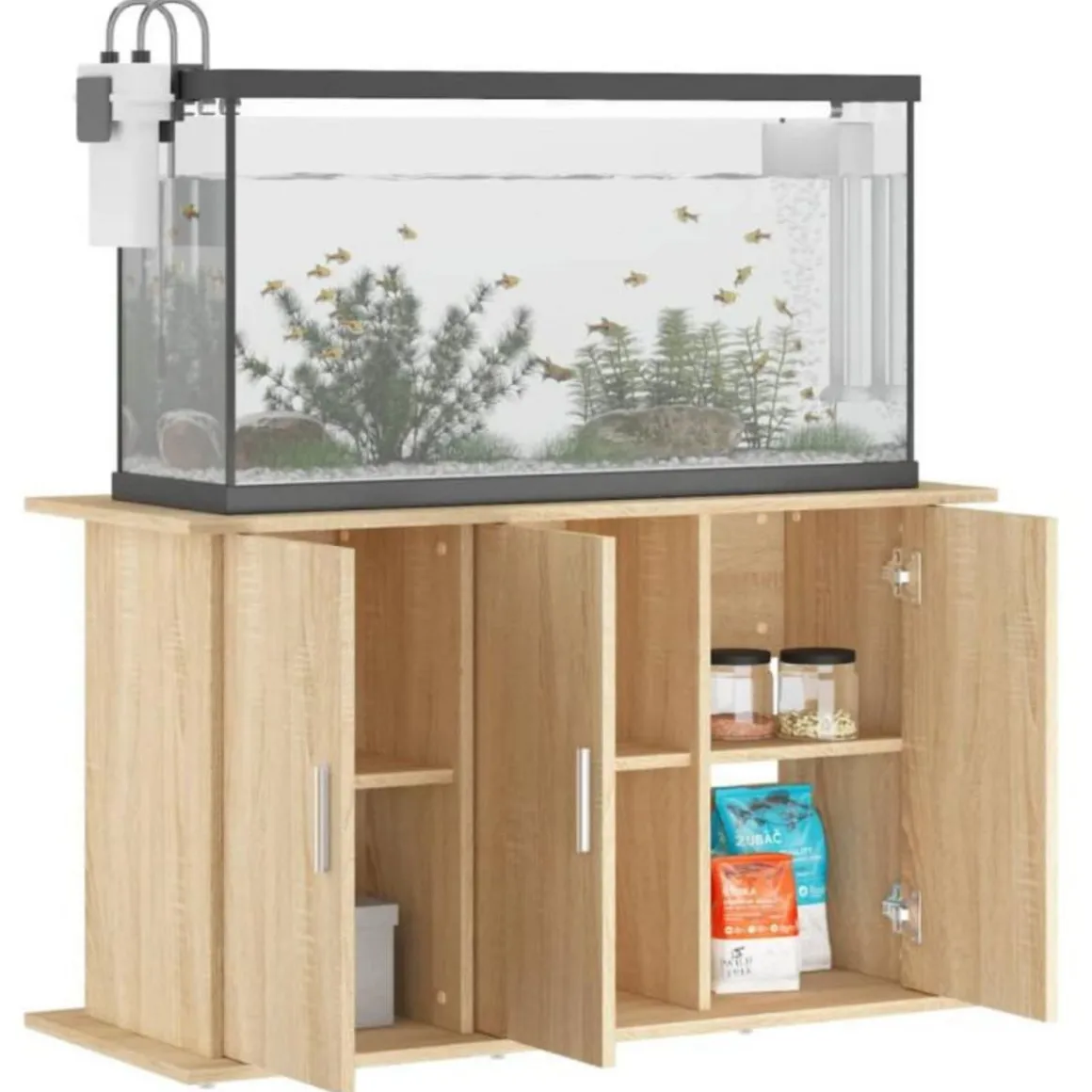Ce support d’aquarium offre un soutien stable et un espace d’affichage sécurisé pour votre aquarium. Que vous éleviez des poissons d’ornement ou que vous organisiez des plantes aquatiques, ce support d’aquarium peut répondre à vos besoins. Matériau durable : le bois d’ingénierie est d’une qualité exceptionnelle avec une surface lisse et présente également résistance, stabilité et résistance à l’humidité.Fonction de rangement : l’armoire pour aquarium est composée d’un grand espace de rangement, le haut est conçu pour placer l’aquarium, et les 6 compartiments avec portes sont pratiques pour stocker les aliments pour poissons, les filets à poissons, les désinfectants, les conditionneurs d’eau, et d’autres articles.Design élégant : ce support pour aquarium a un design élégant qui s’adapte à différents style de décoration intérieure. Il sert non seulement de support pratique pour les aquariums, mais aussi de décoration exquise, ajoutant une touche d’élégance moderne à votre espace de vie. Attention :Pour éviter qu’il ne soit renversé, ce produit doit être utilisé avec le dispositif de fixation au mur fourni.