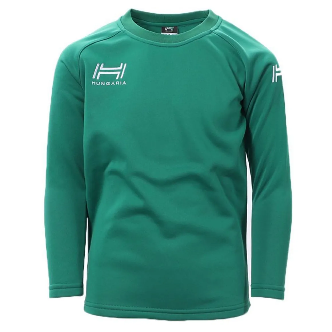 Sweat d’entrainement vert pour enfant de la marque Hungaria. Idéal pour rester au chaud quand il fait froid ! Manches longues Col rond Logo Hungaria brodé en blanc sur la poitrine Coloris intégralement vert Composition : 100% polyester
