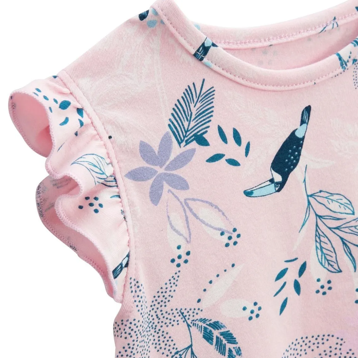 Ce t-shirt rose avec un joli imprimé tropical sera parfait pour tout les looks : romantique avec un petit short en gaze de coton, chic avec un denim… Facile à combiner pour créer des looks adorables ! Produit labellisé STANDARD 100 by OEKO-TEX ® (2309200 CENTEXBEL) Des volants et un imprimé à croquer !