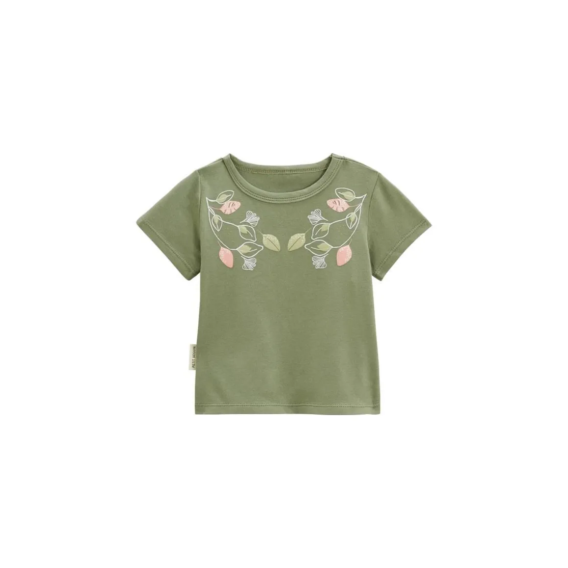 Ce charmant t-shirt kaki, orné de délicats imprimés rose et écru en forme de feuilles, est idéal pour les jours ensoleillés. Il sera un excellent choix pour rafraîchir la garde-robe de votre fille ! Produit labellisé STANDARD 100 by OEKO-TEX ® (BJ020 189402 TESTEX)