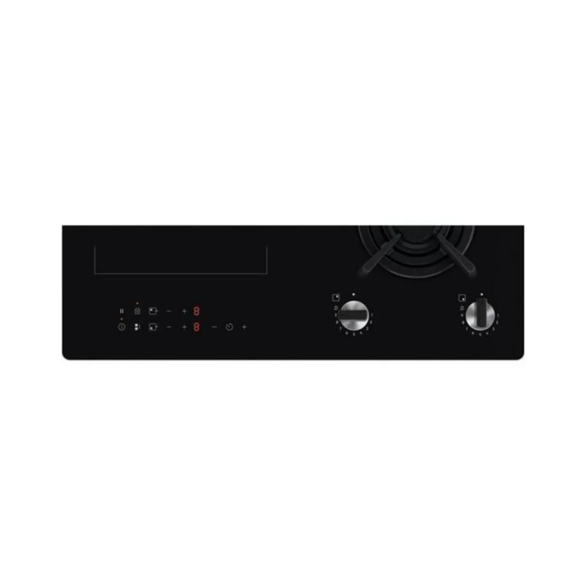 Table de cuisson mixte Gaz/Induction – Induction : 2 foyers Ø 18 cm 2,8 kW bridgeables en une seule zone – 2 Boosters – 1 minuteur – Fonction pause Stop and Go – 6 niveaux de sécurité : Anti-surchauffe, Verrouillage clavier, Arrêt automatique, Anti-débordement, Témoins de chaleur résiduelle et Détection de récipients – Commandes sensitives individuelles. Gaz : 2 brûleurs Matt Black à flamme verticale dont 1 rapide 2,7 kW – Cmmandes StepPower : sélectionnez un niveau de chaleur de 1 à 9 – Allumage intégré aux manettes – Sécurité gaz par thermocouple – Grilles fonte – Installation facilitée Optifix™ – Power Management : connexion possible en 16, 20 ou 32 Ampères – Possibilité d’encastrement à fleur de plan.