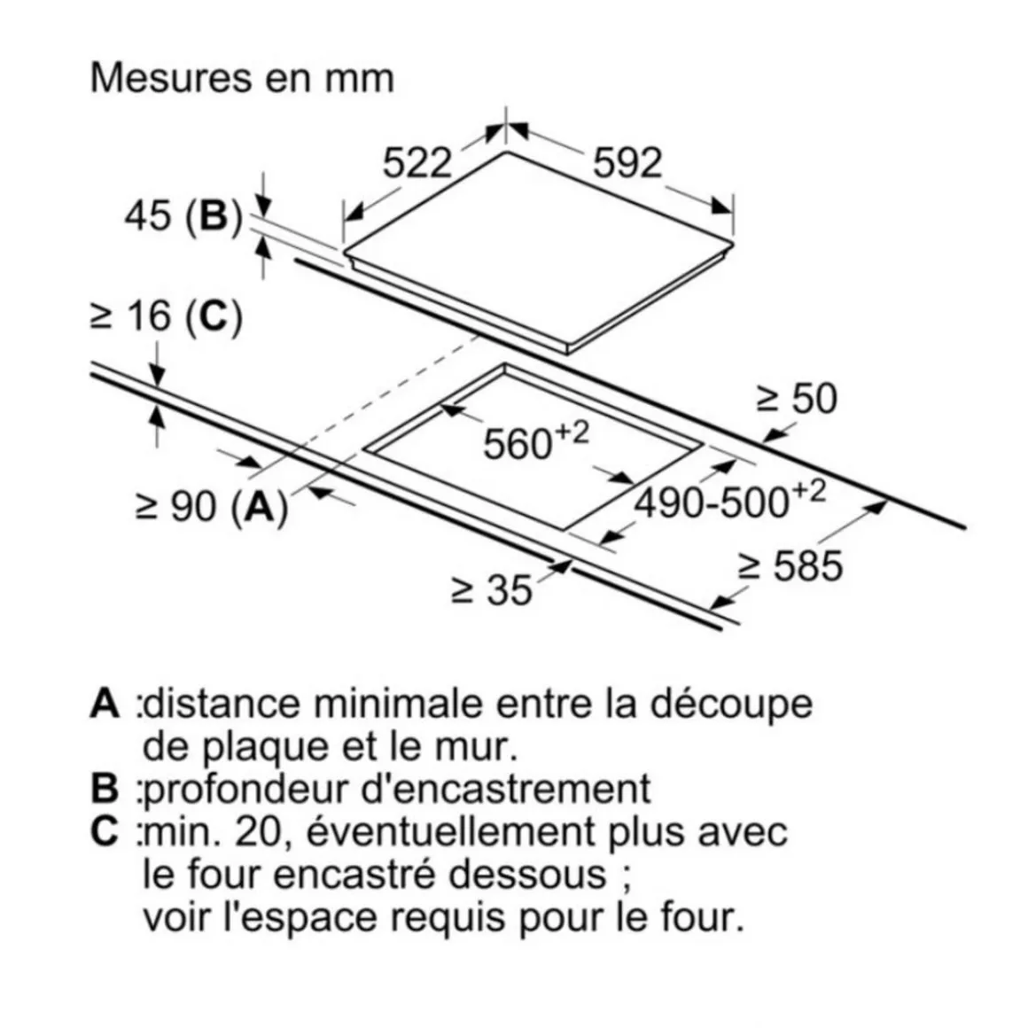 Dimensions Encastrement (LxHxP) : 56 x 4,5 x 49 cm.