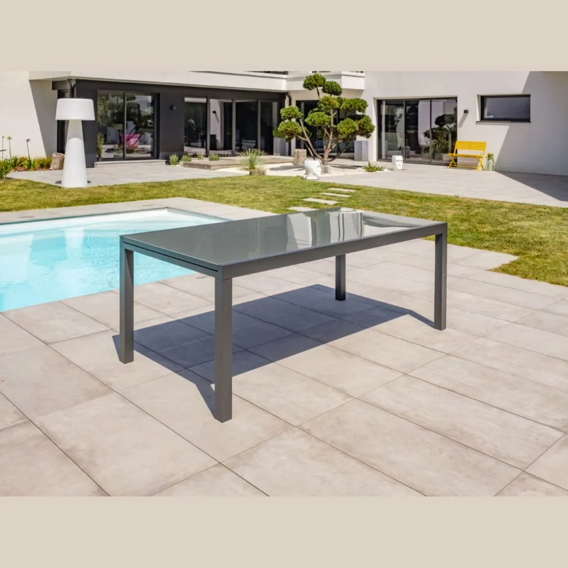 La table de jardin TOLEDE est en aluminium gris anthracite. Son plateau en verre est e?quipe? d’une rallonge astucieuse et discre?te.