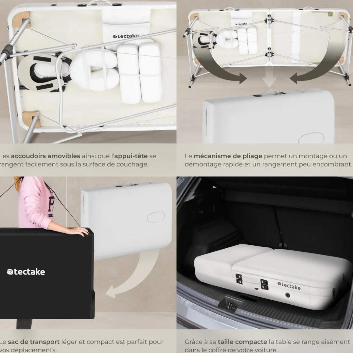 L’appui-tête, le coussin facial et les accoudoirs sont amovibles facilitant le nettoyage et offrant un ajustement personnalisé pour un confort maximal. Une fois la séance terminée la table se plie de manière compacte et se range facilement dans son sac de transport, idéale pour les professionnels ou pour un rangement peu encombrant.