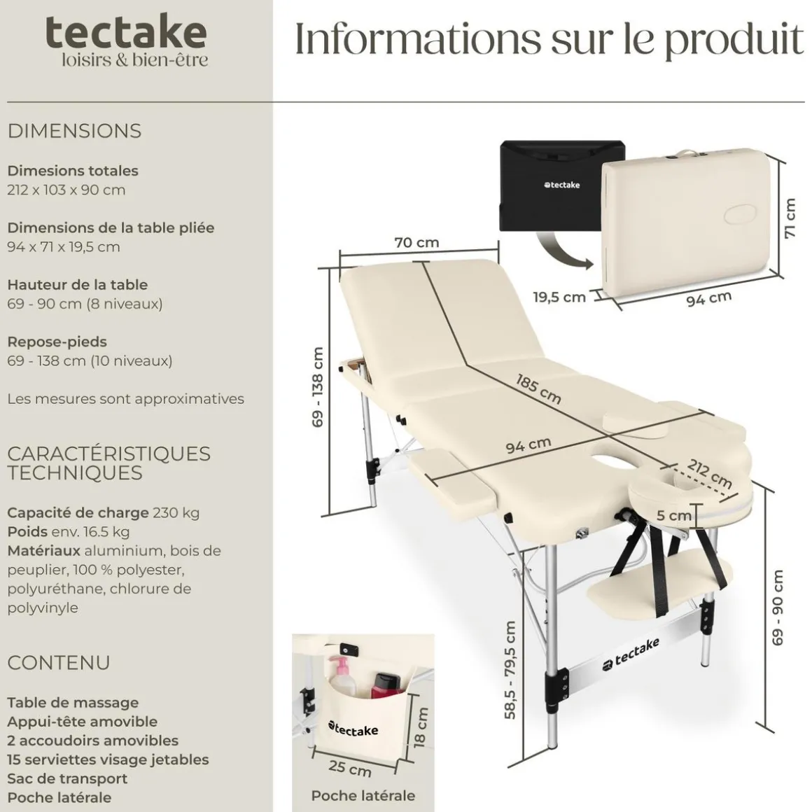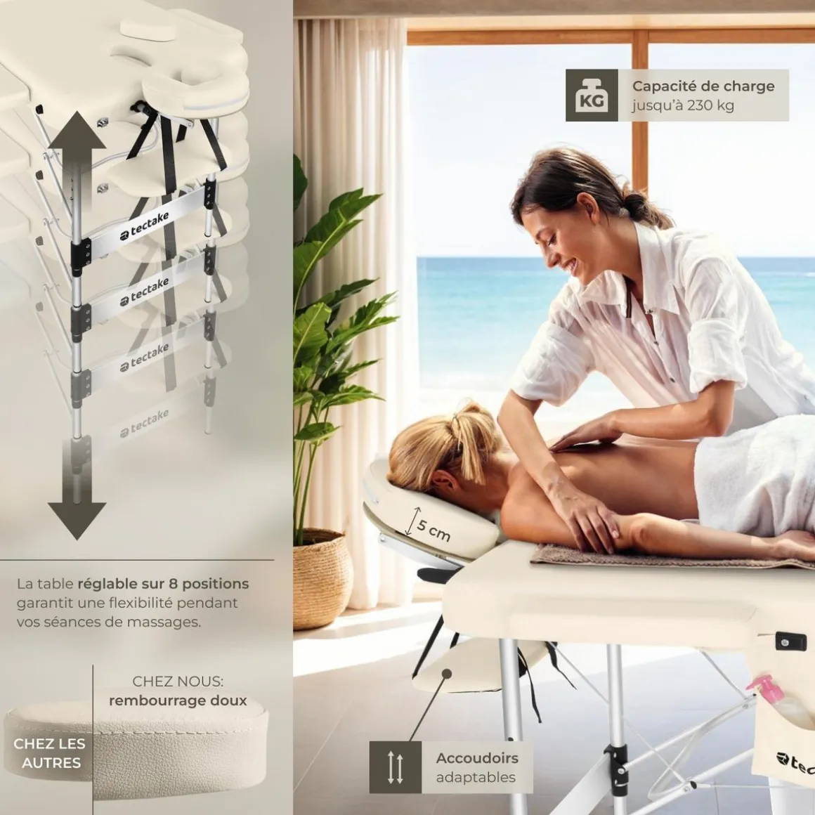 - Table de massage à 3 zones réglable en hauteur avec fonction pliable.