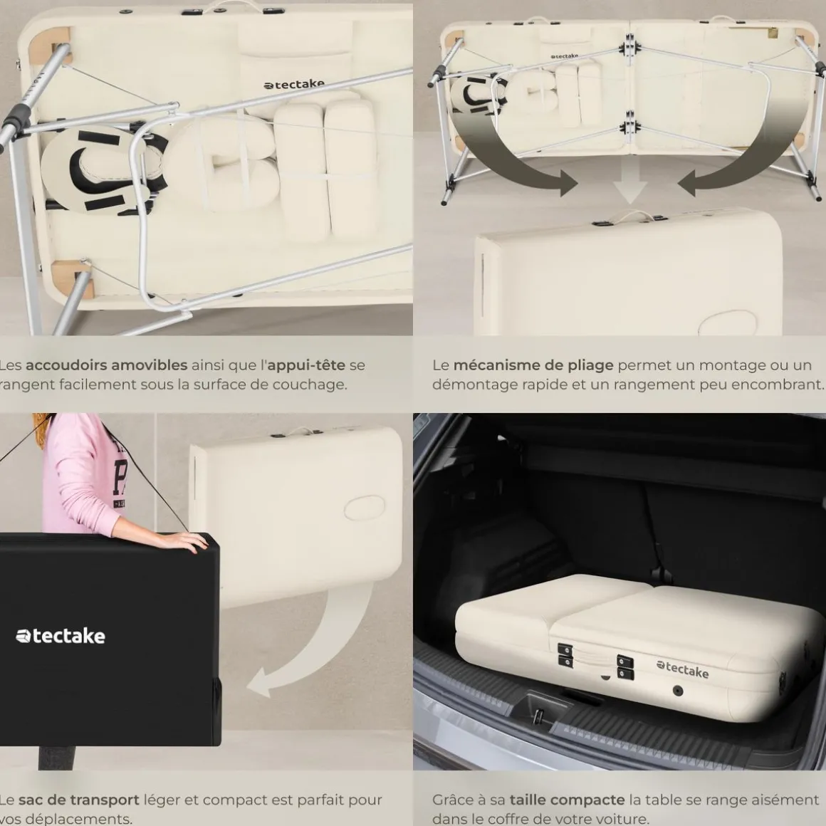 L’appui-tête, le coussin facial et les accoudoirs sont amovibles facilitant le nettoyage et offrant un ajustement personnalisé pour un confort maximal. Une fois la séance terminée la table se plie de manière compacte et se range facilement dans son sac de transport, idéale pour les professionnels ou pour un rangement peu encombrant.