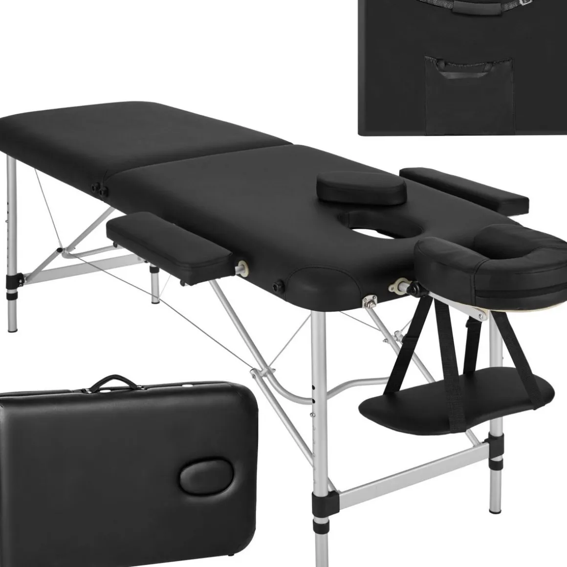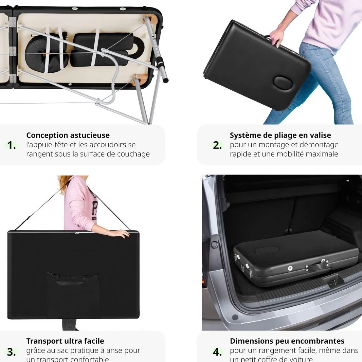 Le système de pliage rapide permet de ranger la table de manière compacte et de la transporter facilement grâce au sac de transport inclus. Les différents éléments, y compris le repose-tête et les accoudoirs, peuvent être fixés sous la table après utilisation, ce qui facilite encore plus le transport et le rangement.