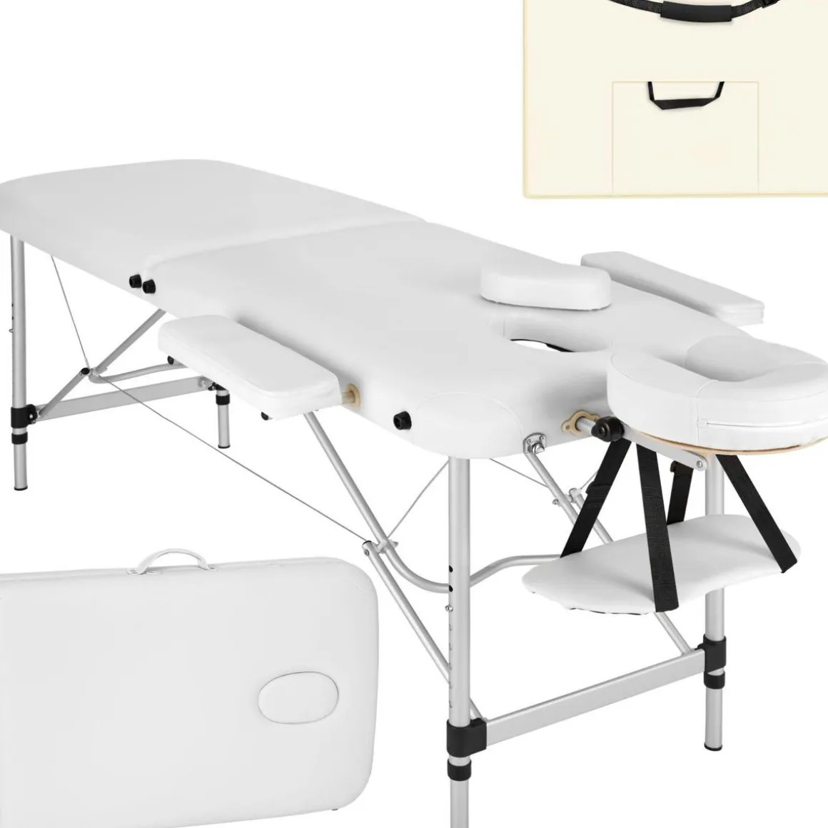 Le système de pliage rapide permet de ranger la table de manière compacte et de la transporter facilement grâce au sac de transport inclus. Les différents éléments, y compris le repose-tête et les accoudoirs, peuvent être fixés sous la table après utilisation, ce qui facilite encore plus le transport et le rangement.