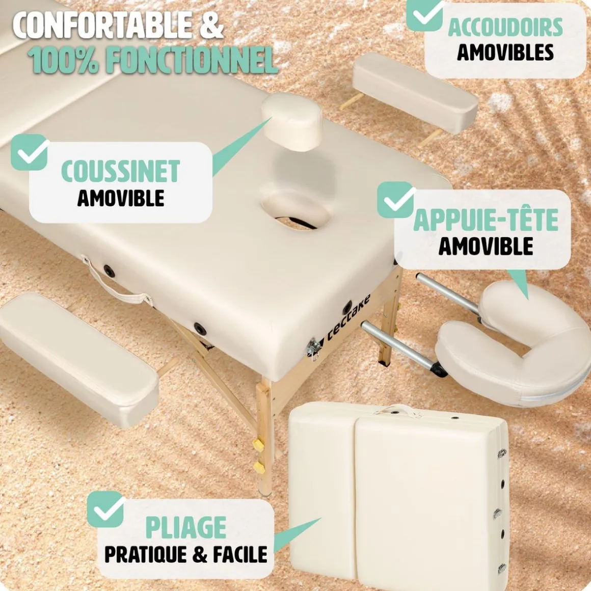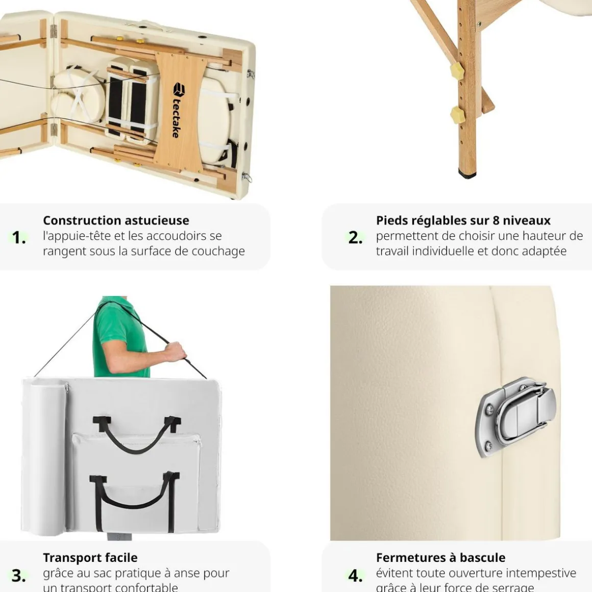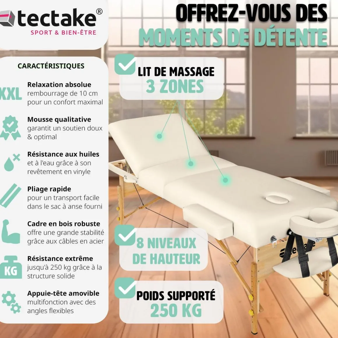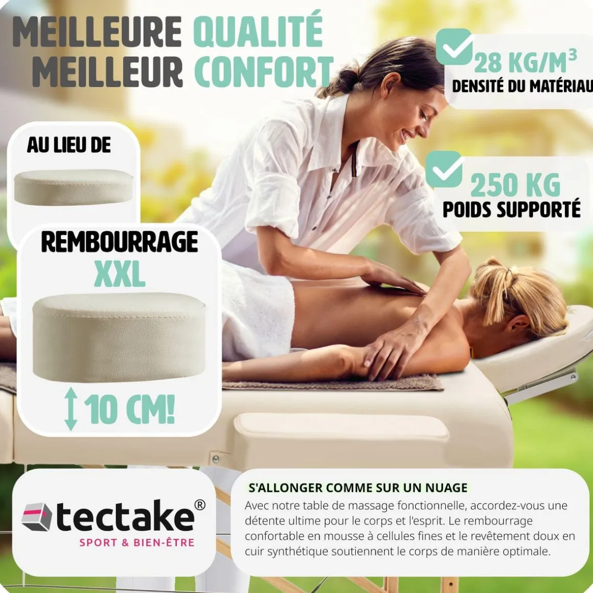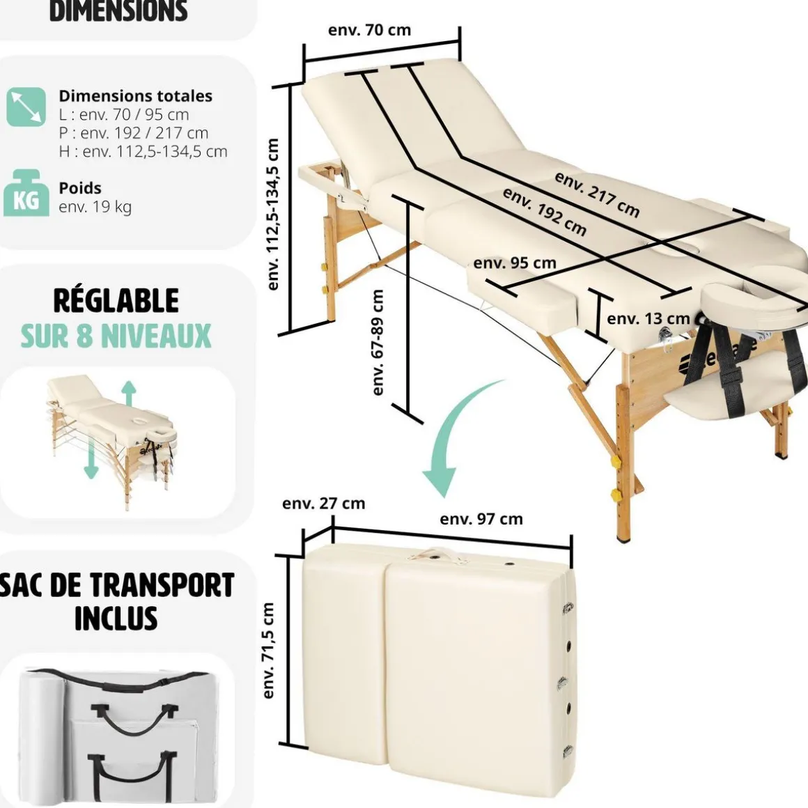 Découvrez le summum du bien-être avec notre table de massage portable pliante à 3 zones. Conçue pour offrir une stabilité et un confort de repos inégalés, cette table est idéale pour vos séances de détente à domicile. Grâce à son rembourrage complet d’environ 10 cm en mousse synthétique de haute qualité, elle s’adapte parfaitement à la forme de votre corps, répartissant le poids de manière homogène et ménageant ainsi les points d’appui. Confort et Qualité Exceptionnelle. Le rembourrage confortable en mousse synthétique Oxford 600D Very Strong assure un confort inégalé. Le revêtement en vinyle souple est résistant aux griffures, aux coups, ainsi qu’à l’eau et aux huiles, garantissant une longévité exceptionnelle. Vous pouvez ainsi profiter d’une surface de massage qui reste en excellent état au fil du temps. Facilité de Transport et d’Utilisation : Cette table de massage pliante est équipée d’un système pliable pratique, prêt à l’emploi en quelques secondes. Grâce à sa housse pratique, incluse dans le prix, elle est facilement transportable. Le design ingénieux permet de fixer les accoudoirs et l’appui-tête sous la table à l’aide des sangles de maintien, puis de replier le châssis pour un transport sans effort. Réglable pour un Confort Personnalisé. La table de massage est non seulement pliable mais également réglable en hauteur, vous permettant d’ajuster la table selon vos besoins spécifiques. Le repose-tête et les accoudoirs ajustables ajoutent un niveau de confort supplémentaire, garantissant une expérience de massage optimale. Dimensions et Accessoires Inclus. Avec des dimensions de 218 x 102 x 65 – 90 cm, cette table offre un espace suffisant pour des massages confortables. Le sac de transport inclus permet une mobilité facile, que vous souhaitiez utiliser la table à domicile ou l’emporter ailleurs. En résumé, cette table de massage portable pliante à 3 zones est un choix parfait pour ceux qui recherchent à la fois confort et praticité. Profitez d’un massage relaxant pour soulager les tensions, stimuler la circulation sanguine et retrouver votre calme intérieur.