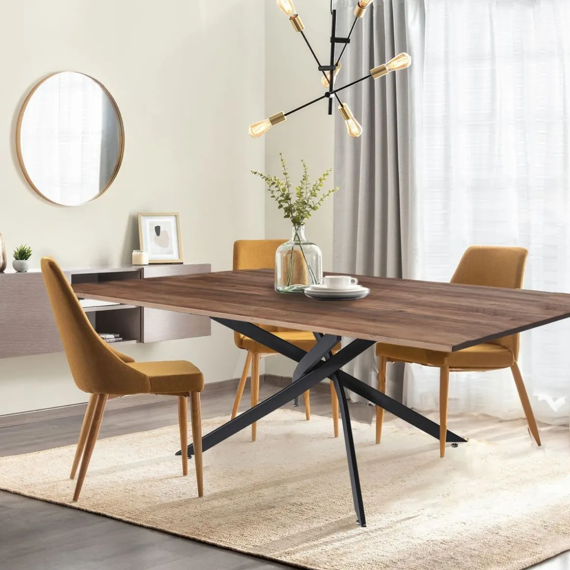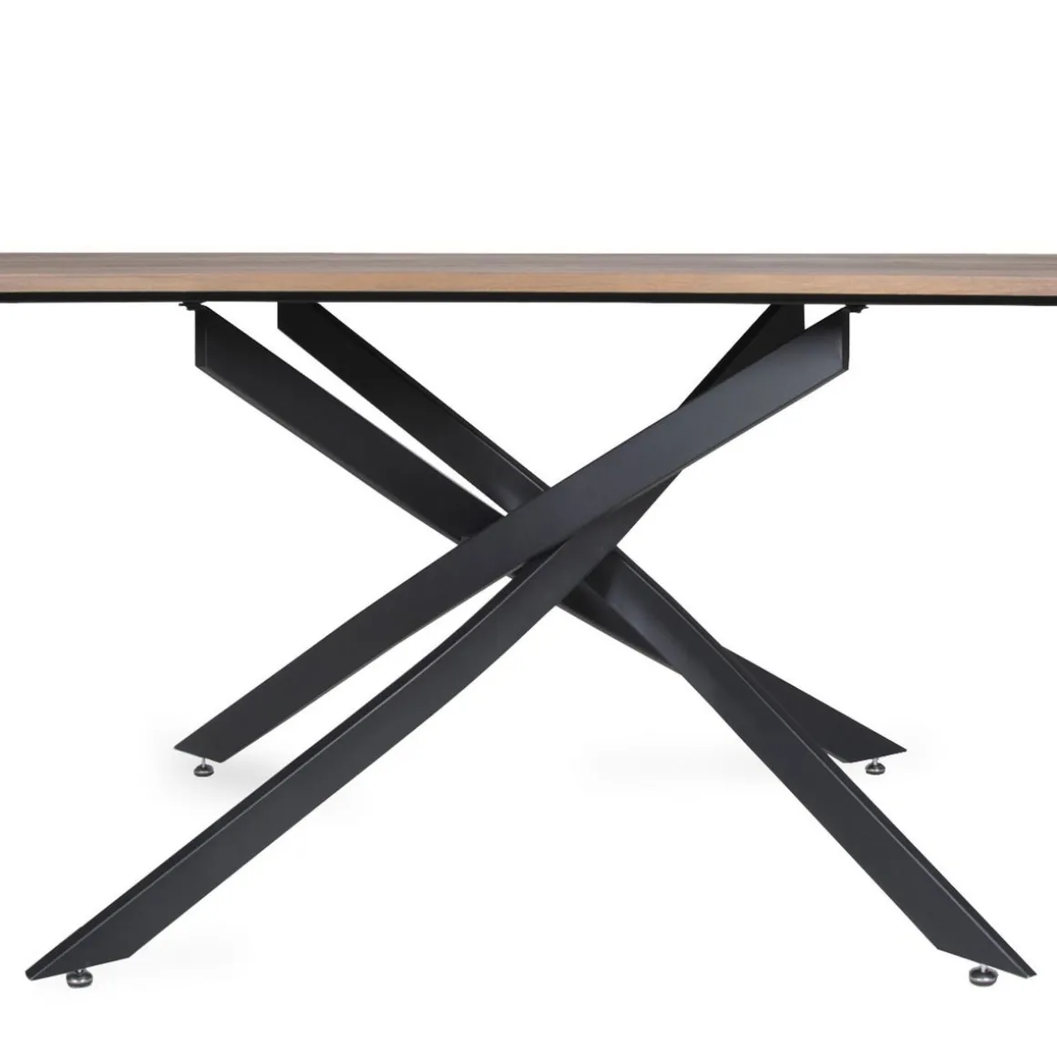 La table ROYALTY avec ses lignes épurées et son design industriel, amènera une touche résolument tendance aux aménagements.Son piètement en métal croisé en fait une pièce design et originale.Recevez jusqu’à 6 convives dans les meilleures conditions !Le Plus produit:On aime le piètement métal croisé qui donne un style sculptural !Caractéristiques : Dimensions globales: Longueur 160 cm x largeur 90 cm x Hauteur 75,5cmDimensions du plateau : L .160 x l. 90 x H. 1,8 cmCapacité : jusqu’à 6 personnesMatériaux : Plateau en panneau MDF avec décor chêne, piètement en métal noir.À monter soi-même