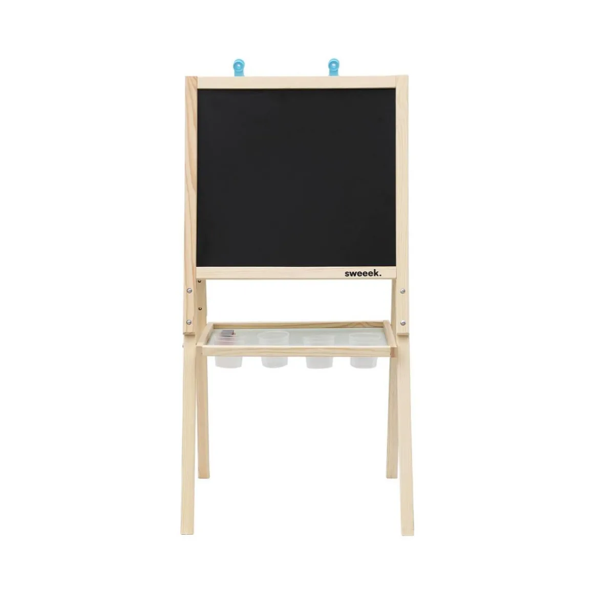 Le tableau double face KIDDO est le prochain élément indispensable de votre salle de jeu. Avec ses lettres aimantées et ses 2 attaches vos enfants passeront des heures à s’amuser. On aime son espace de rangement sous les deux faces du tableau ainsi que les 4 pots en plastiques fournis pour y déposer craies et stylos. Sa structure en bois lui permet de s’intégrer facilement à la décoration de la chambre de votre enfant. Ses pieds évasés lui permettent quant à eux de rester stable lors de son utilisation.