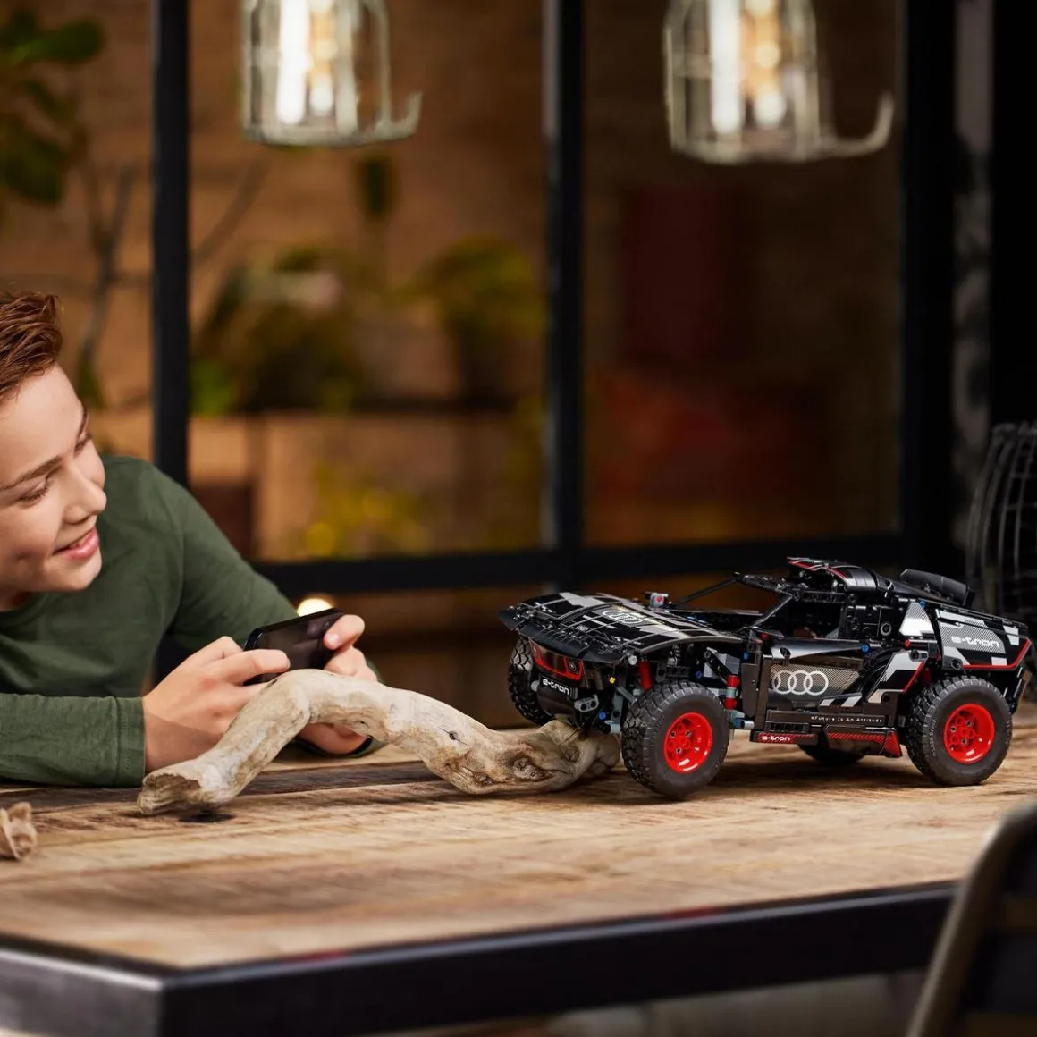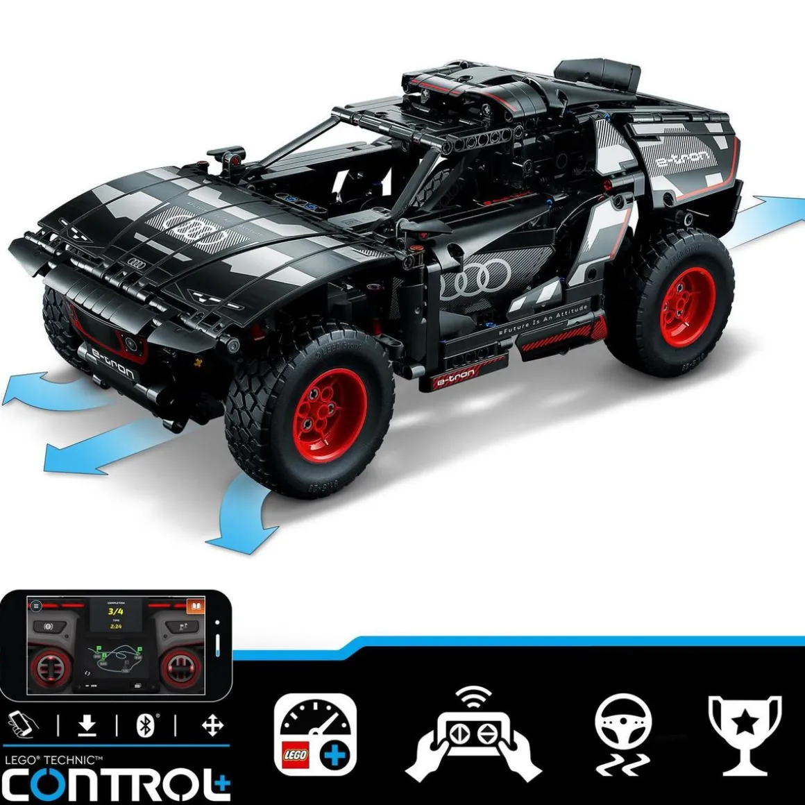En construisant, ils explorent la voiture électrique originale, construite par Audi pour résister aux conditions exigeantes du Rallye Dakar. Ce modèle regorge de détails réalistes tels que les suspensions individuelles sur les 4 roues et inclut un nouvel élément de roue Technic créé spécialement pour refléter le design de l’Audi originale. L’application CONTROL+ permet de tester la voiture de rallye avec les commandes marche avant, marche arrière et direction.