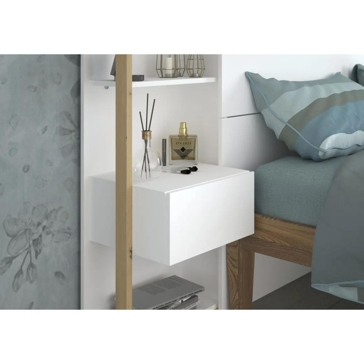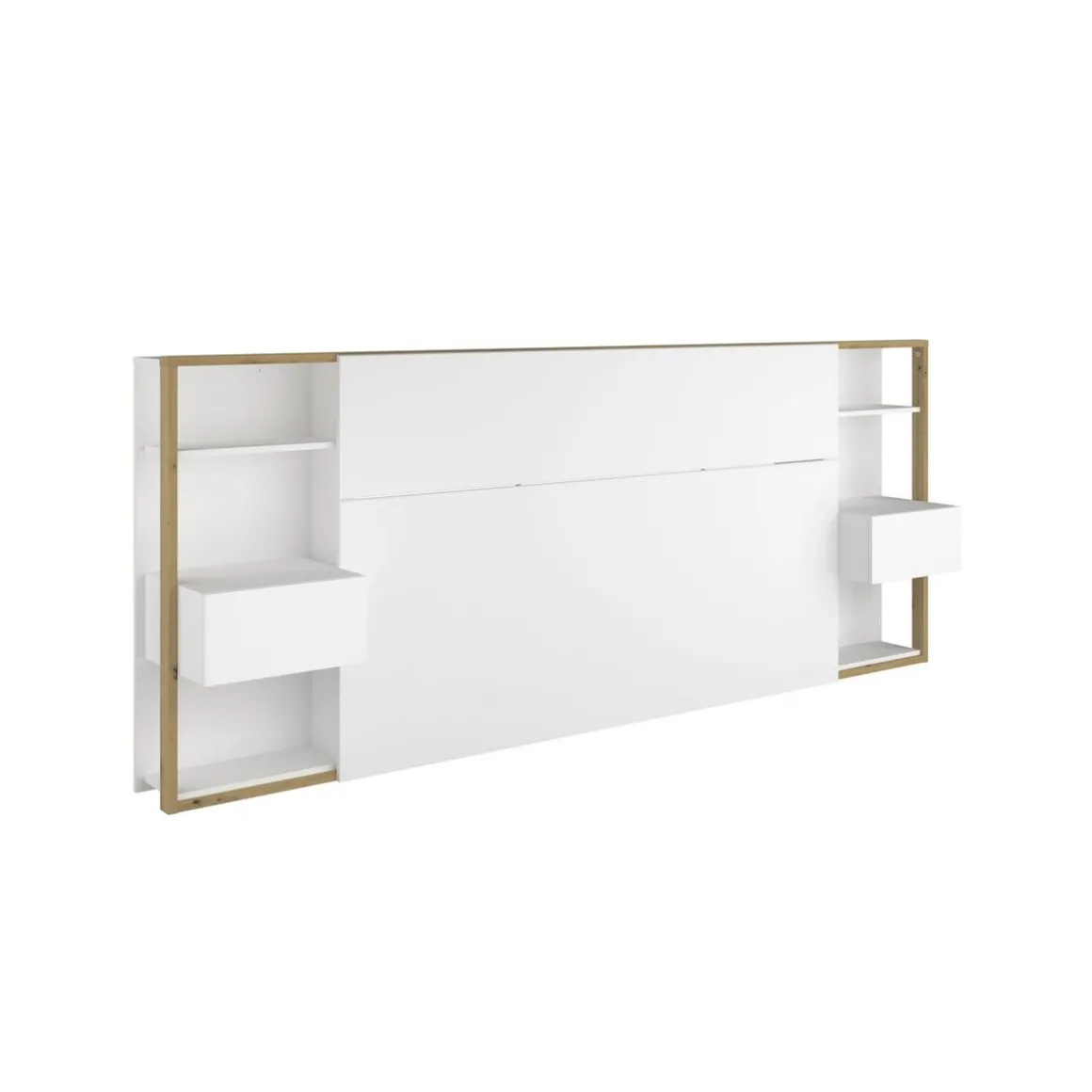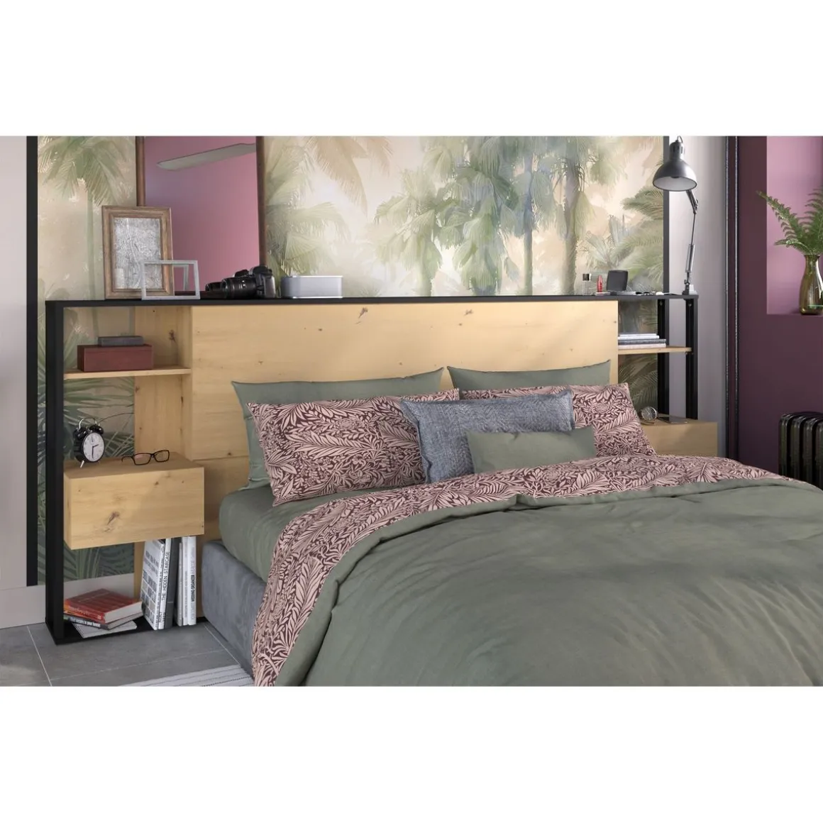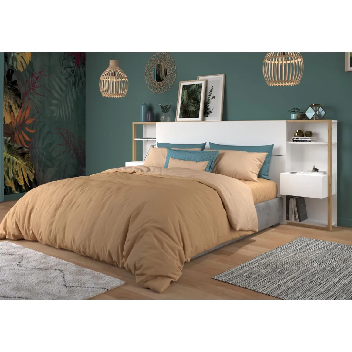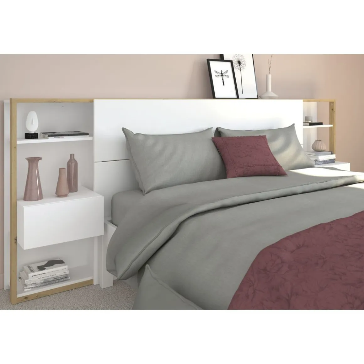 Une tête de lit fabriquée en France qui viendra habiller votre lit en lui apportant du rangement et du confort ! En chêne et noir ou chêne blanc, choisissez celle qui vous convient pour votre chambre. De chaque côté du lit, vous y trouverez un tiroir et des tablettes permettant d’y installer déco, luminaire ou livres.