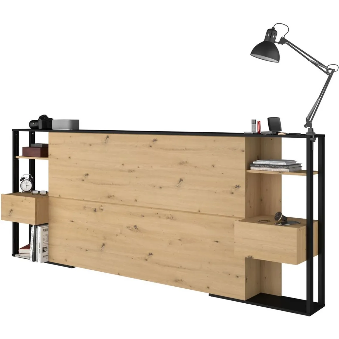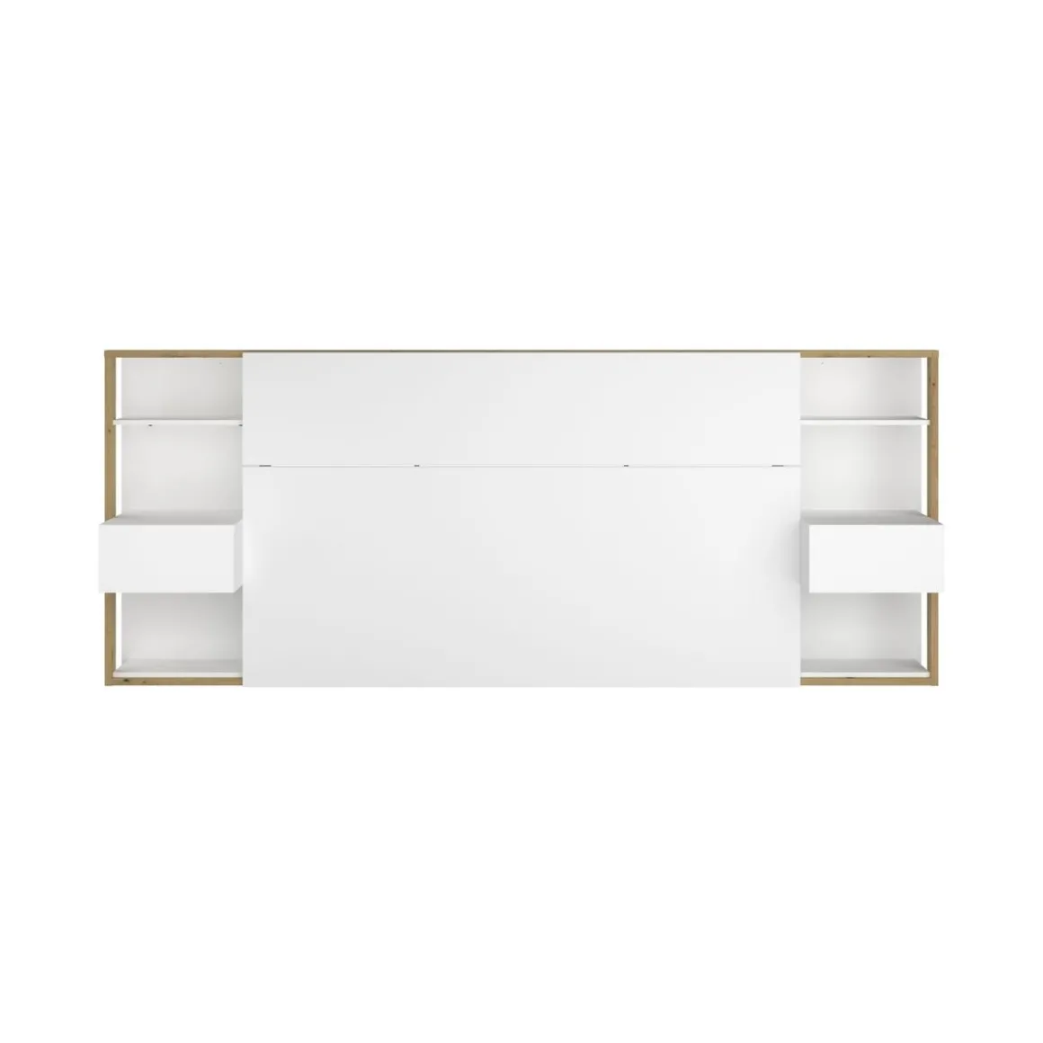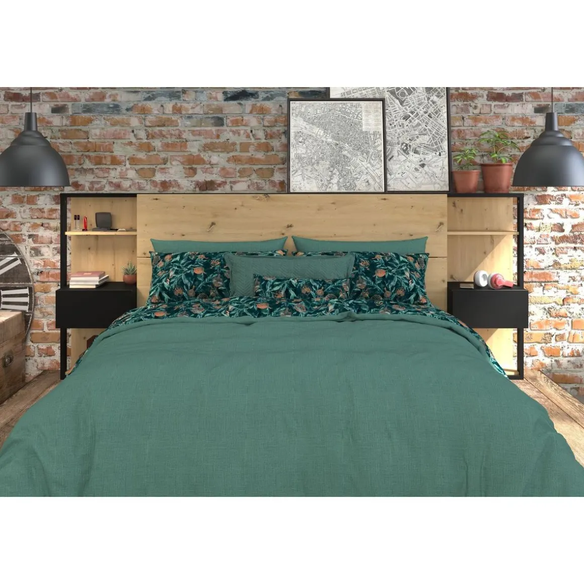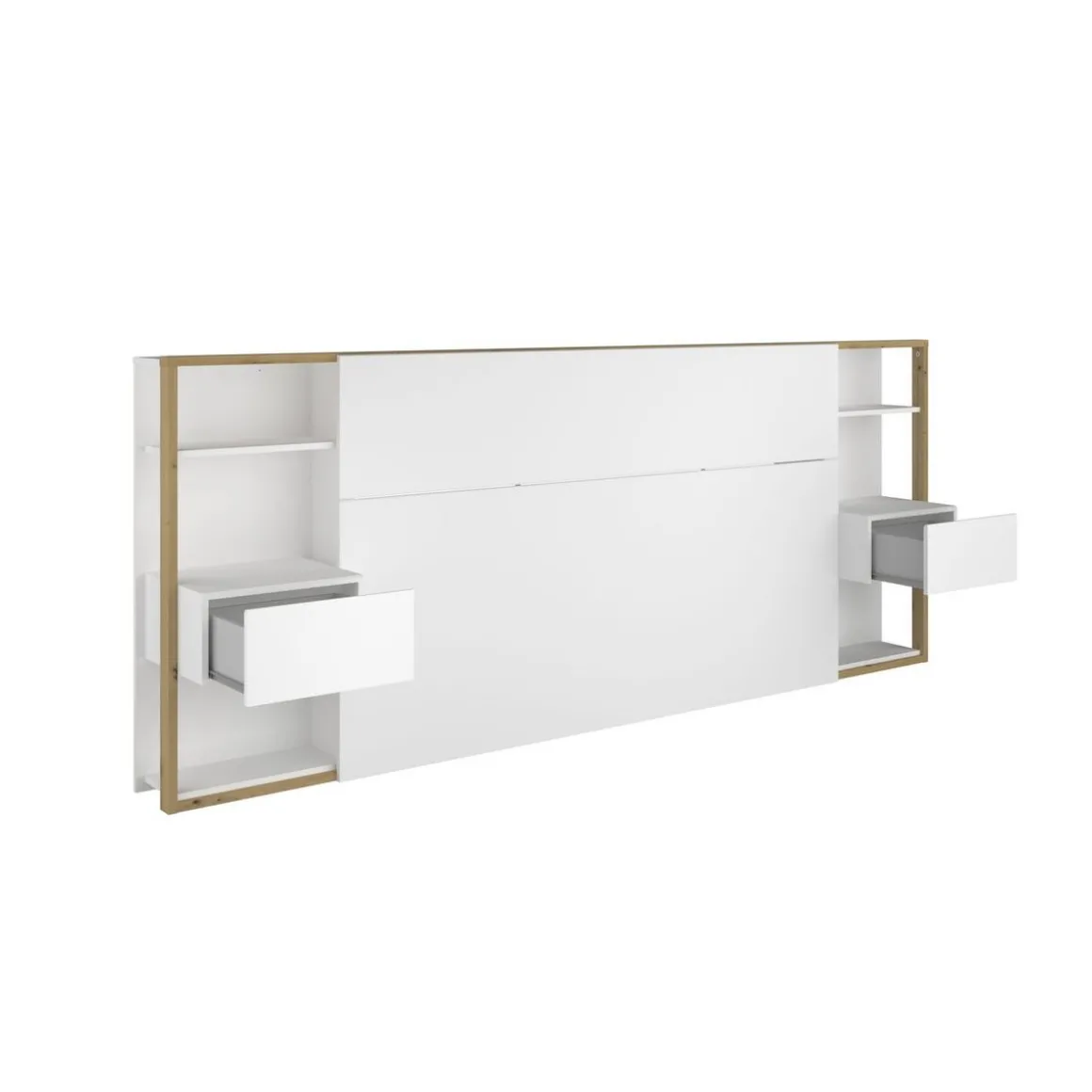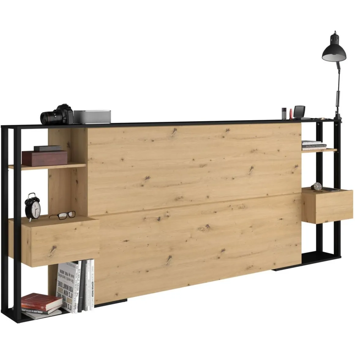 Une tête de lit fabriquée en France qui viendra habiller votre lit en lui apportant du rangement et du confort ! En chêne et noir ou chêne blanc, choisissez celle qui vous convient pour votre chambre. De chaque côté du lit, vous y trouverez un tiroir et des tablettes permettant d’y installer déco, luminaire ou livres.