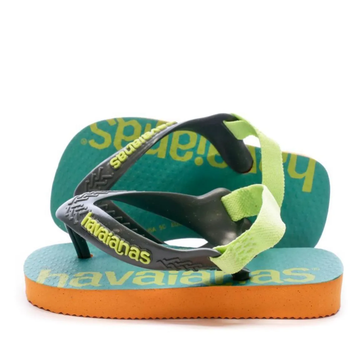 Optez pour ces tongs de la marque Havaianas ! Coloris : orange, vert, noir Semelle synthétique Bride en plastique