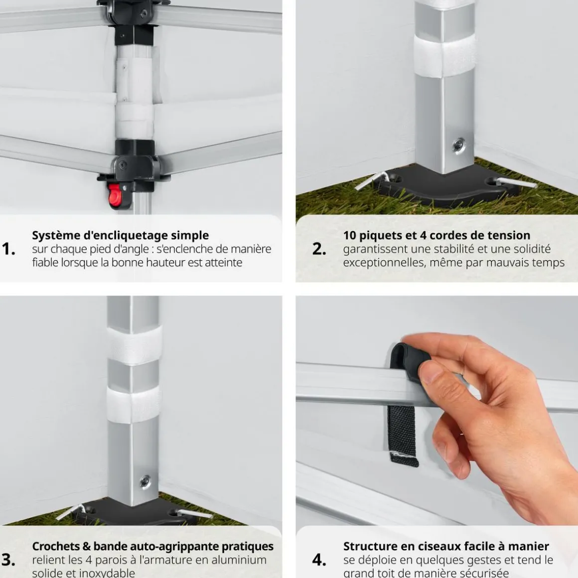 - Fixation des parois par crochets et bandes attaches auto-agrippantes