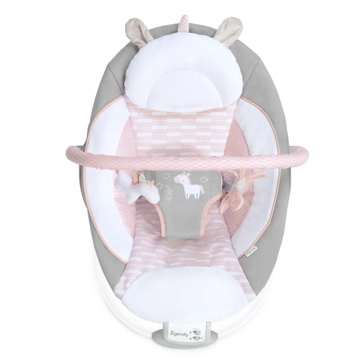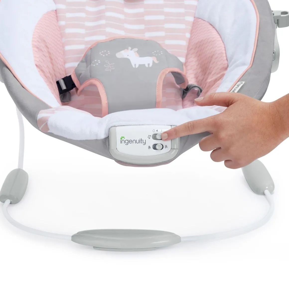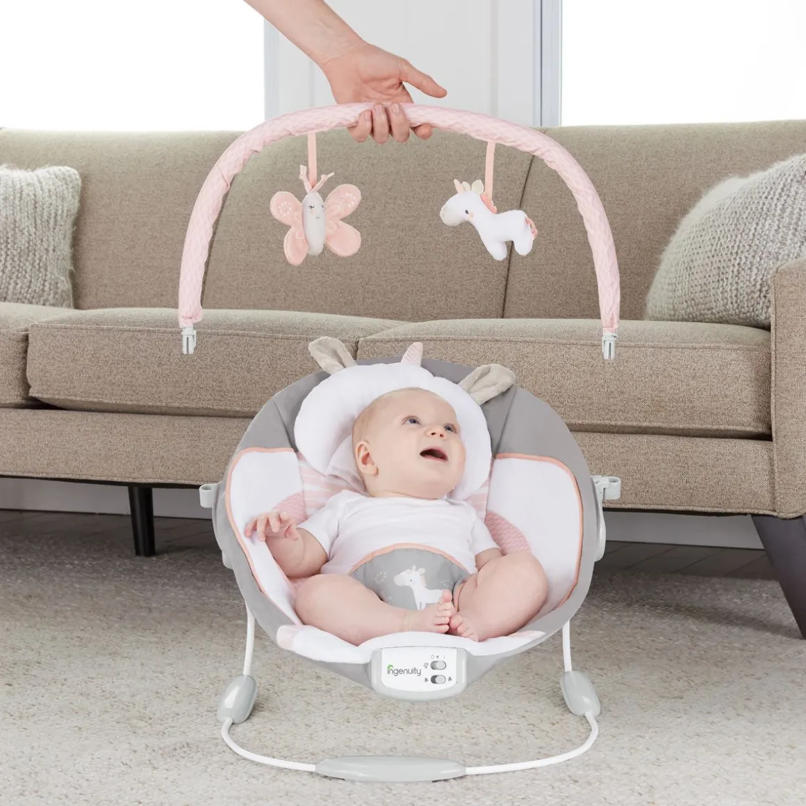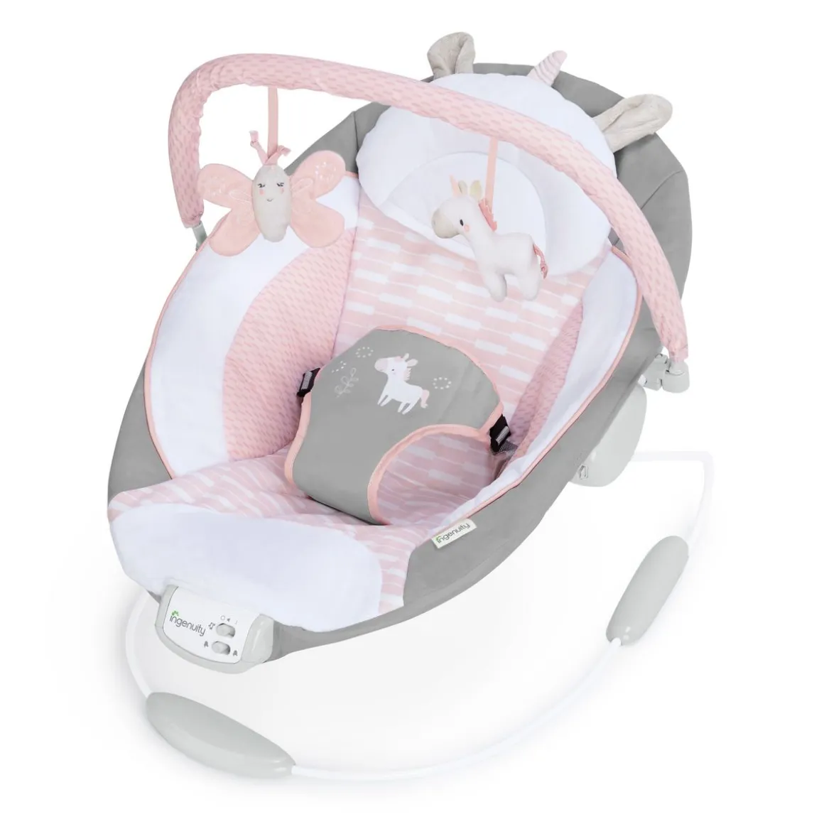Votre petit sera chouchouté dans ce transat avec vibrations et musique Audrey d’Ingenuity au tissu en peluche haut de gamme et doté de coussins de maintien. L’appui-tête licorne magique peut être retiré lorsque bébé devient grand. Calmez-le et réconfortez-le avec 8 mélodies et des vibrations apaisantes. Ce siège rebondissant est sûr avec ses pieds antidérapants et son harnais 3 points pour que bébé se repose et que vous soyez rassuré. L’adorable motif rose et les jouets papillon et licorne en font le transat idéal pour une petite fille. Emmenez ce siège léger de pièce en pièce afin d’avoir un espace sûr pour bébé où que soyez.