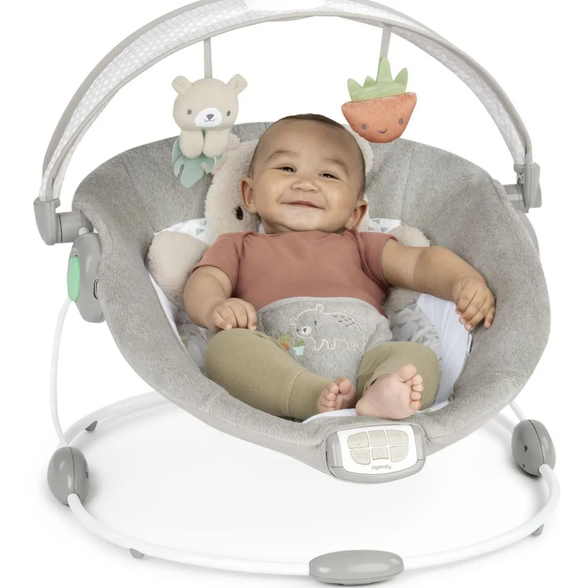 Ce transat Ingenuity InLighten Bouncer – Nate est idéal pour les parents très occupés, bébé est en sécurité. Pour les plus petits jusqu’à 6 mois ou 9kgs; âge ou poids max., Idéal le traversin petit ours (Nate) pour encore plus de support et confort. Traversin amovible tout doux à utiliser comme doudou. Siège totalement inclinable pour encore plus de confort, Avec arc d’activités lumineux et clignotant apaisant pour jouer; 2 jouets en peluche amusants inclus (un ours et une plante) bébé apprend à toucher et attraper, Stimulation des sens avec des vibrations douces, apaisantes, des airs calmes, sons nature et bruits blancs. Fonctionne avec 3 piles C (non incluses), Conception sécurisée et confort assurée; avec harnais 3 points d’attache bébé est en sécurité; housse de siège et traversin nettoyage facile, dimensions totales 62 x 60 x 59cm