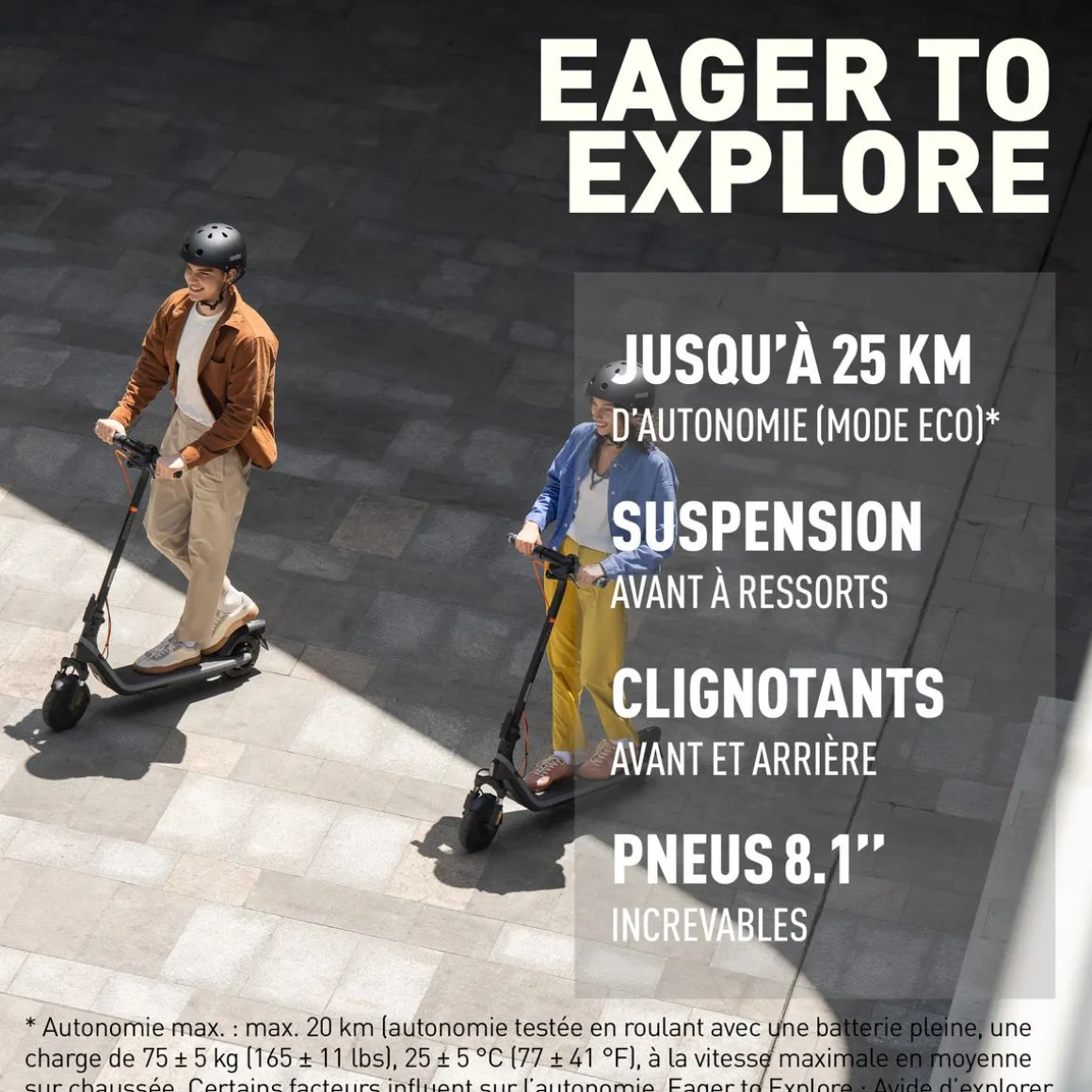 La vitesse et l’autonomie varient selon le terrain, la vitesse et le poids de l’utilisateur.