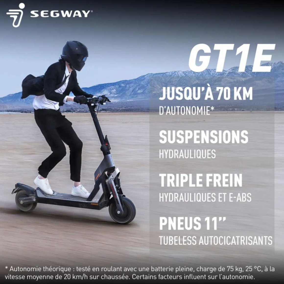 | Spécificités | Suspensions hydrauliques, freins hydrauliques, 70 km d’autonomie, pneus 11 » autocicatrisants | |
