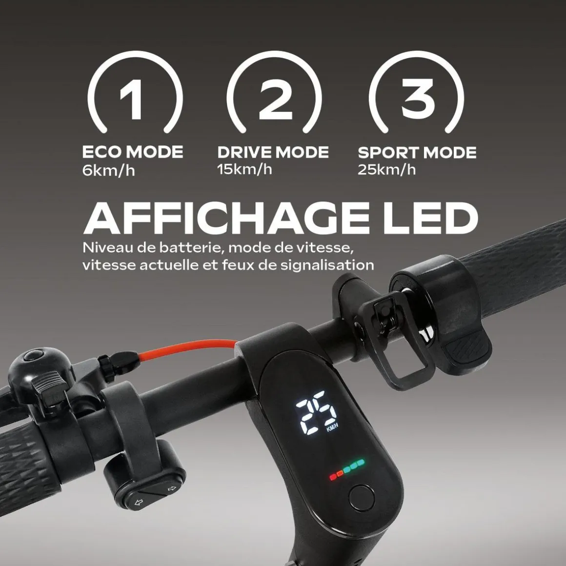 | Ecran d’affichage | Oui, permet de visionner des informations relatives à la conduite (autonomie batterie, distance parcourue, mode de vitesse, etc.) | |