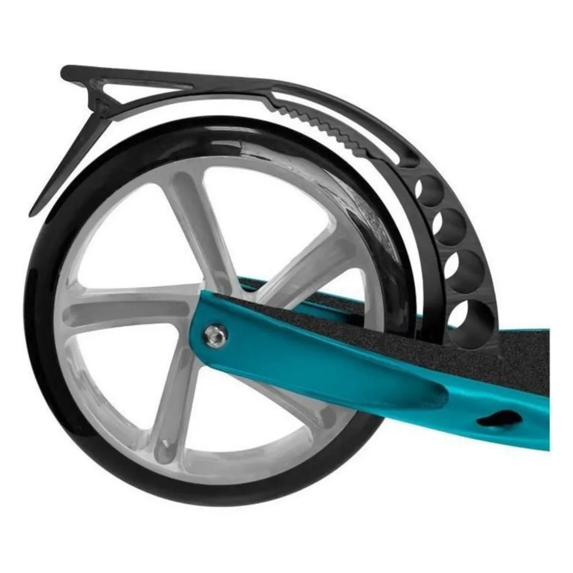 Trottinette pliable 200mm. Amortisseur avant. Roues PU 200mm x 30 mm. Ajustable en hauteur sur trois niveaux : 93/97/101 cm, pour des utilisateurs de 1,45m a 1,95m. Roulements ABEC 9. Large plateau alu anti-dérapant 560mmx135mm. Plateau ergonomique rabaissé pour faciliter le patinage et limiter la fatigue. Béquille.