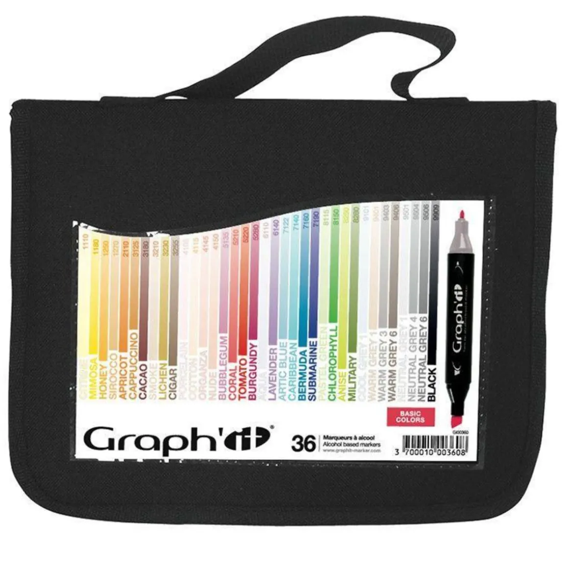 La trousse de 36 marqueurs Graph’It a été élaboré par des illustrateurs afin de vous offrir l’essentiel des couleurs basiques dont vous avez besoin pour créer une multitude de dessins. Rangés dans une trousse en tissu noir très facile à transporter grâce à sa poignée, les feutres sont de haute qualité et contiennent toutes les couleurs et les nuances dont vous aurez besoin. Le feutre est composé d’une pointe japonaise nerveuse en fibres synthétiques et d’une autre plus fine (0,5 mm) qui vous permettra de dessiner des détails et autres traits fins. Réalisez des bandes dessinées, des mangas, du scrapbooking et autres activités grâce à ce coffret. Contient 36 feutres.