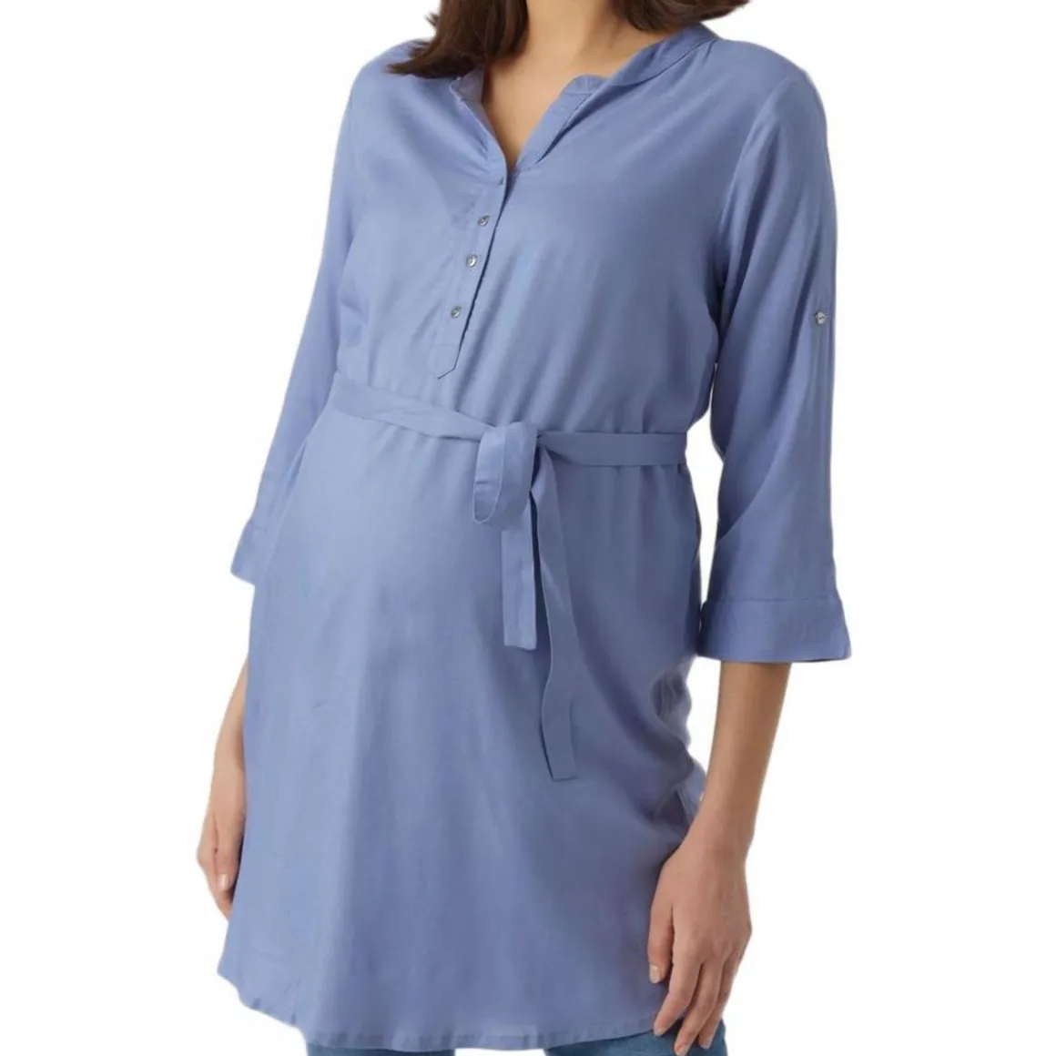 Optez pour cette tunique de maternité de la marque MAMALICIOUSColoris : Bleu Col VManches 3/4Ceinture à la taille Fonction d’allaitement avec bouton ou fermeture éclairComposition : 100% Viscose