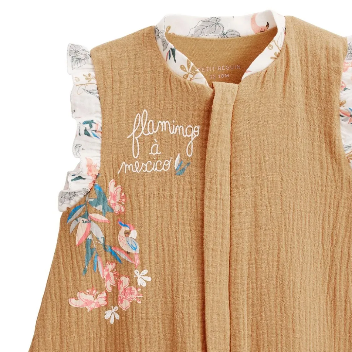 Voici l’incontournable pour les petits aventuriers qui explorent tout en désirant le confort. Notre turbulette Flamingo débarque dans un magnifique coloris ocre, accompagné de son fidèle compagnon flamant rose, prêt à suivre bébé partout. On craque pour sa matière en gaze de coton, à la fois douce et légère, parfaite pour assurer le bien-être de votre tout-petit. Produit labellisé STANDARD 100 by OEKO-TEX ® (BJ020 189402 TESTEX) 2-en-1 : allongé les pieds rentrés, debout les pieds sortis ! Ouverture passe-pieds, parfait pour permettre à bébé de faire ses premiers pas Ouverture zippée sur l’avant avec patte de protection Pieds antidérapants En coton gaufré tout doux et confort Indice de chaleur : TOG 1 Pour plus d’informations, voir les avertissements et recommandations dans l’onglet détails et entretien *Cet article taille grand, nous vous conseillons de prendre au minimum une taille en dessous.