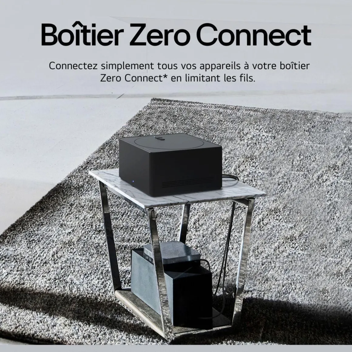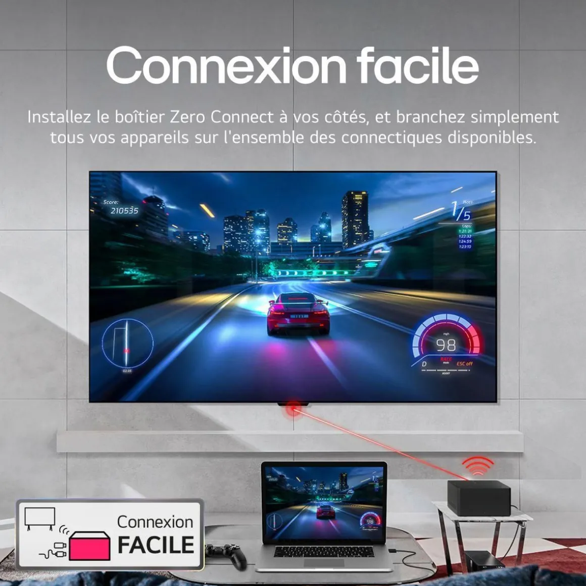 | Connectique déportée | boîtier Zero Connect. Ce boîtier déporté sans fil, regroupe toute la connectique du téléviseur (USB, HDMI…) et envoie un signal jusqu’en 4K 120i/s à l’écran pour que l’image apparaisse | |