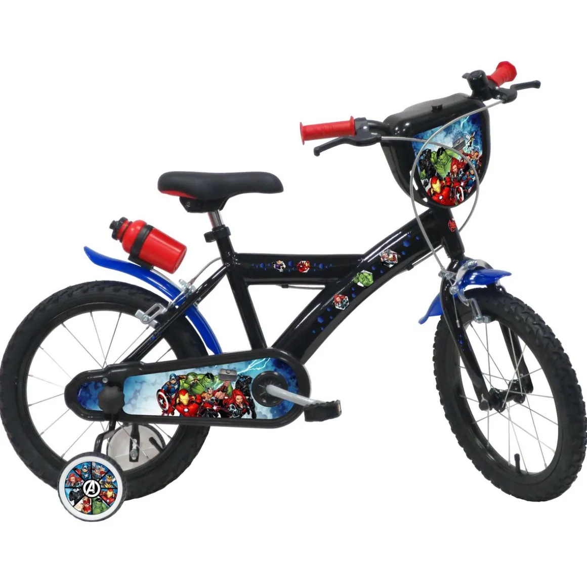 Vélo 16 » Garçon Licence Avengers pour enfant de 105/120 cm avec stabilisateurs à molettes – Plaque décorative avant – Porte bidon – 2 freins