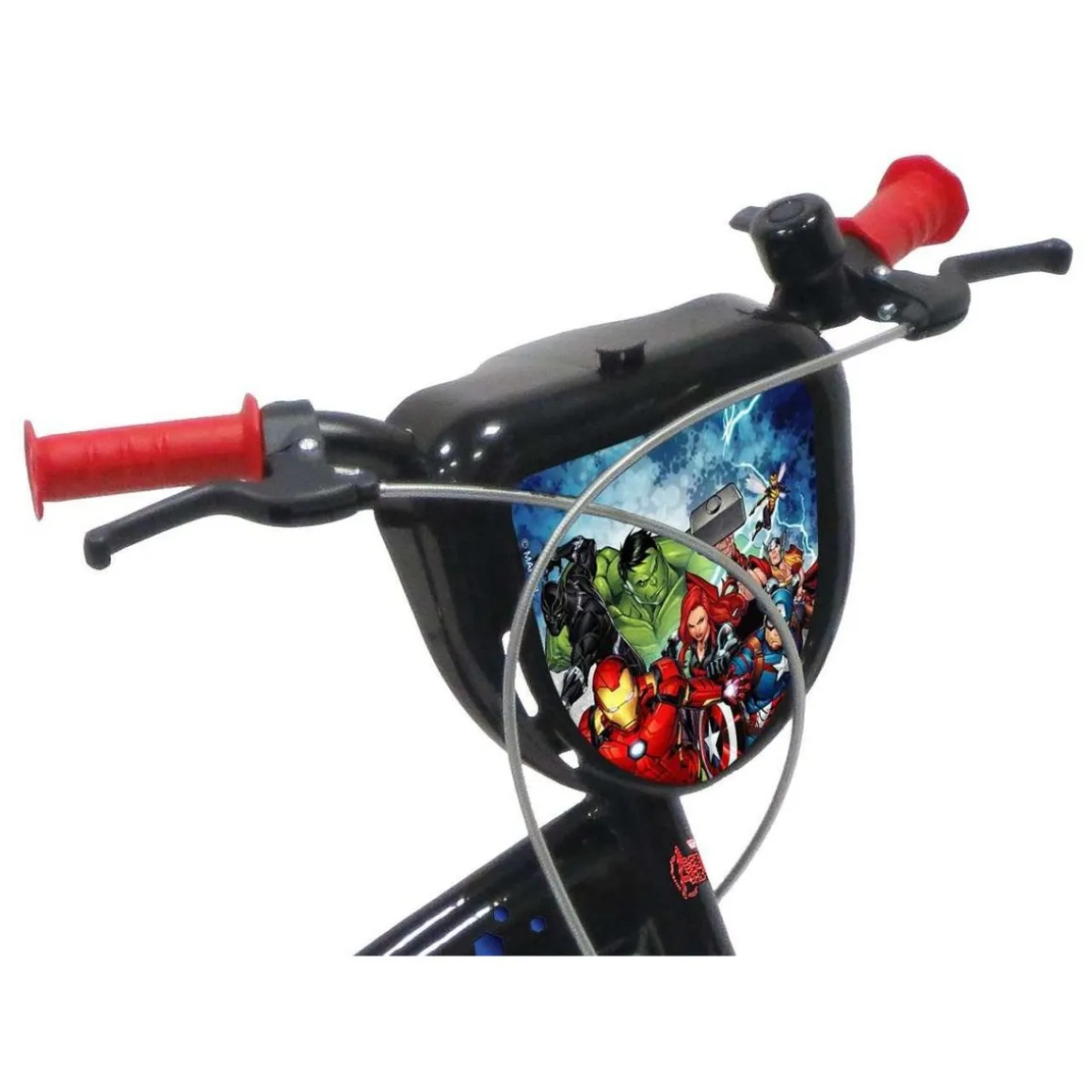 Vélo 16 Garçon Licence Avengers pour enfant de 105/120 cm – Cadre Acier – Direction et pédalier en nylon – Roue libre monovitesse – Freins avant et arrière Calliper – Selle réglable – Carter de chaîne intégral – Gardes boue et poignées spécifiques pour augmenter la protection de l’enfant – Jantes à rayons – Pneus gonflables noirs – Stabilisateurs (montage sans outil) – Plaque décorative avant – Porte bidon – Gourde – Avertisseur sonore – Eclairage à piles fournies – Catadioptres de roues