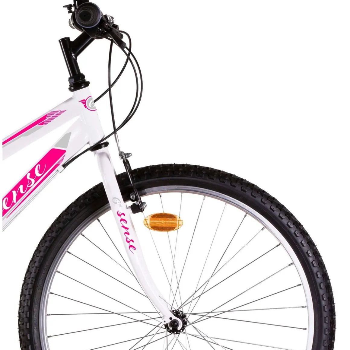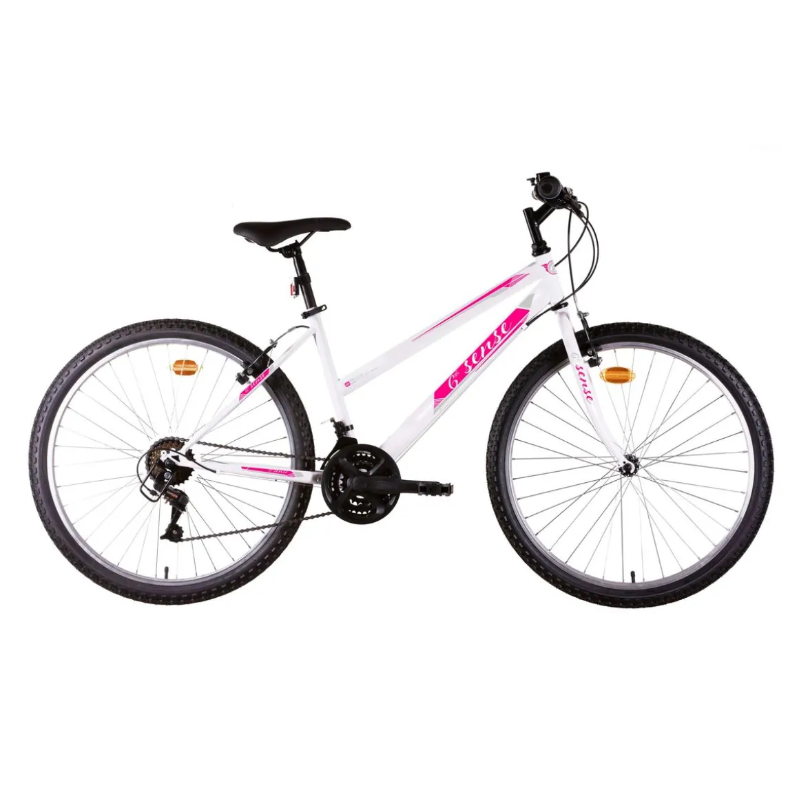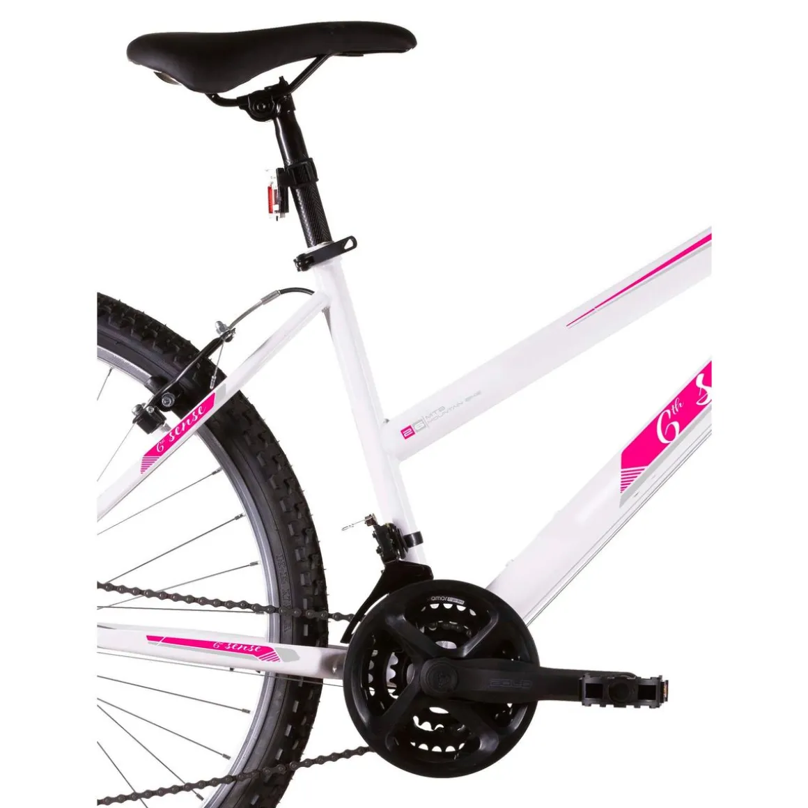 VTT 26 Rigide Femme 6ème Sense – Cadre acier rigide – Fourche rigide – 18 vitesses indexées par poignées tournantes – Dérailleur arrière indexé – Potence plongeur – Freins avant et arrière V-Brake avec étriers acier & Leviers en résine noire – Jantes aluminium avec attache rapide avant & pneus noirs – Blocage rapide tige de selle – Sonnette – Eclairage à piles fournies.