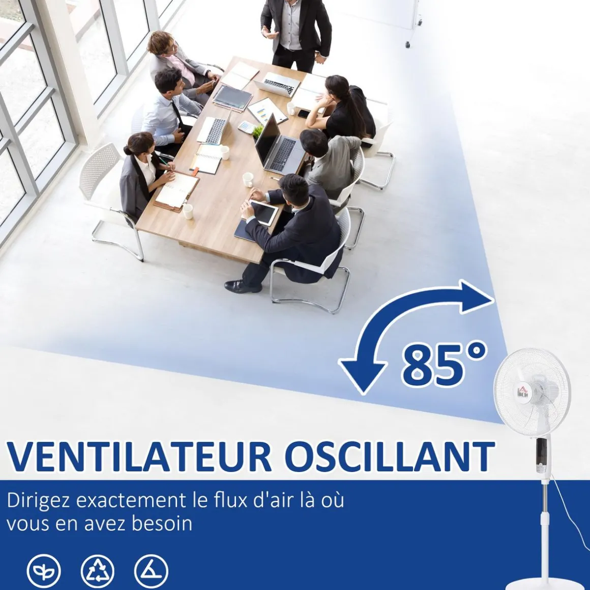 – Ventilateur sur pied oscillant à 85° et de hauteur réglable : idéal pour bénéficier d’une ventilation optimale sur une large zone de votre choix